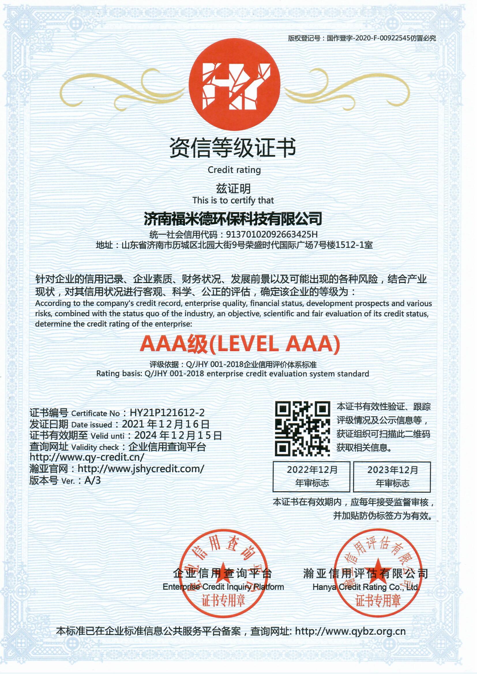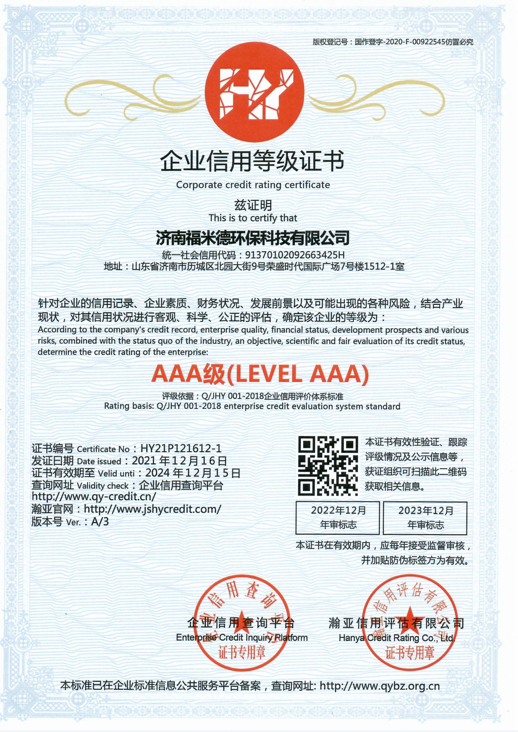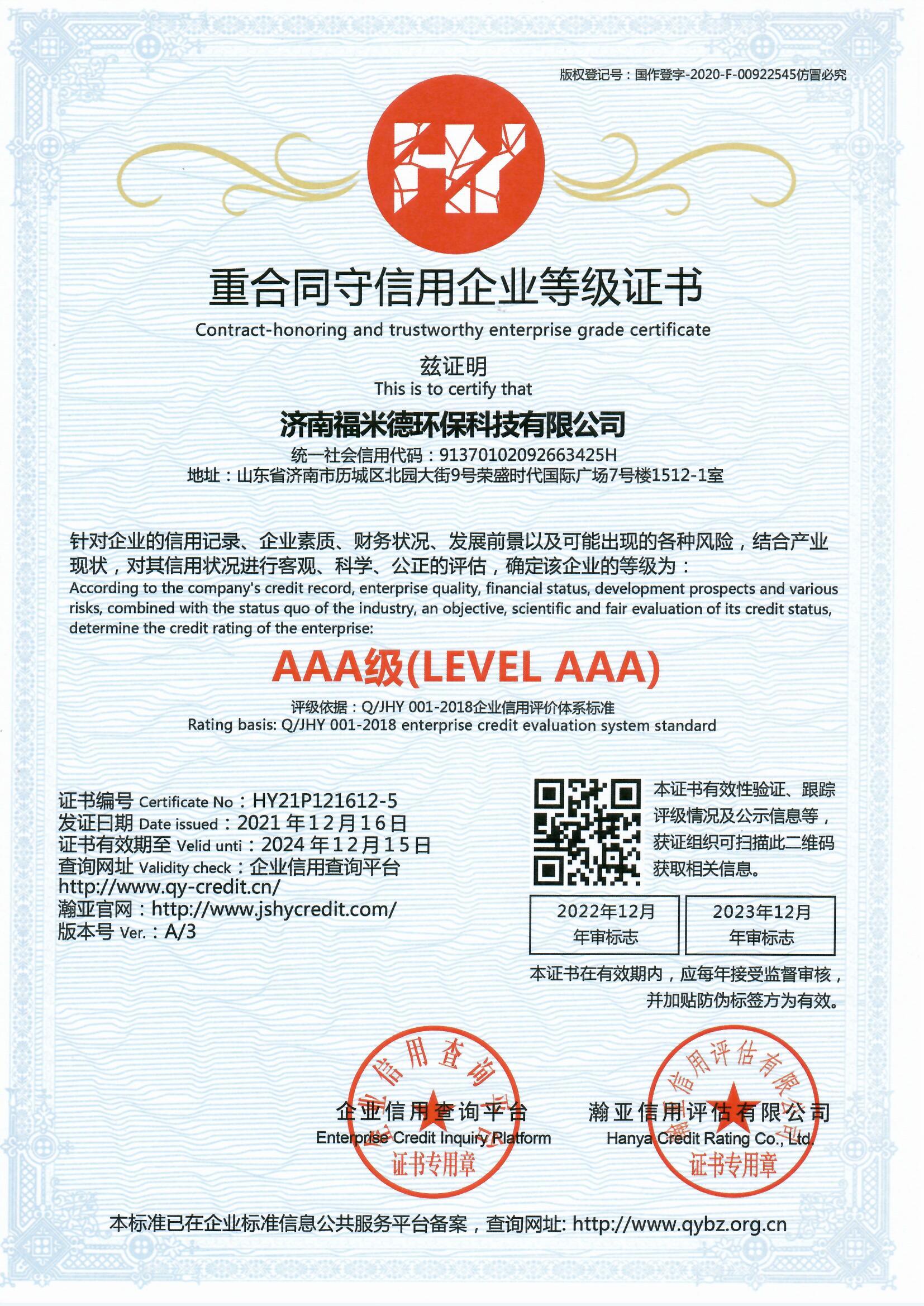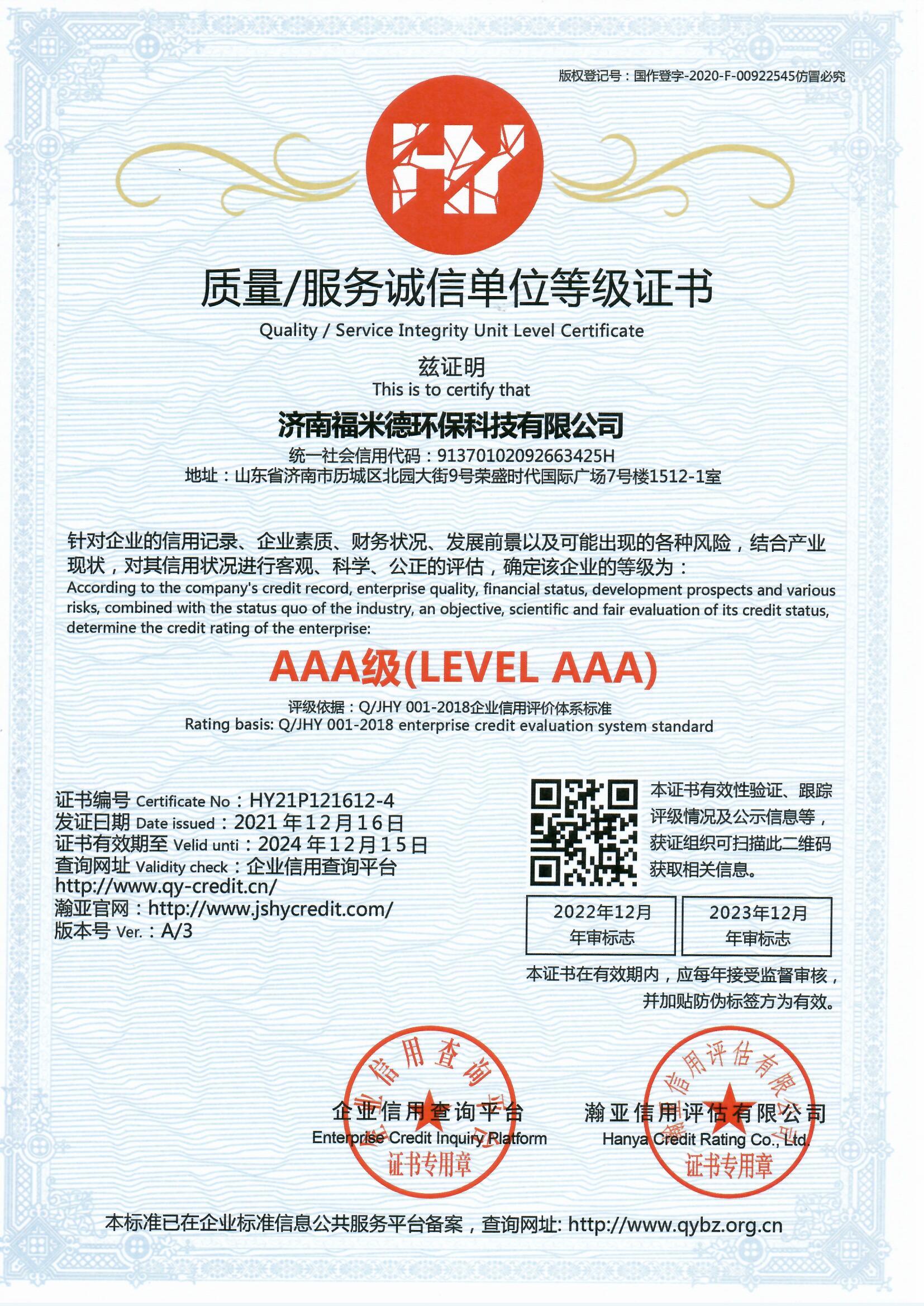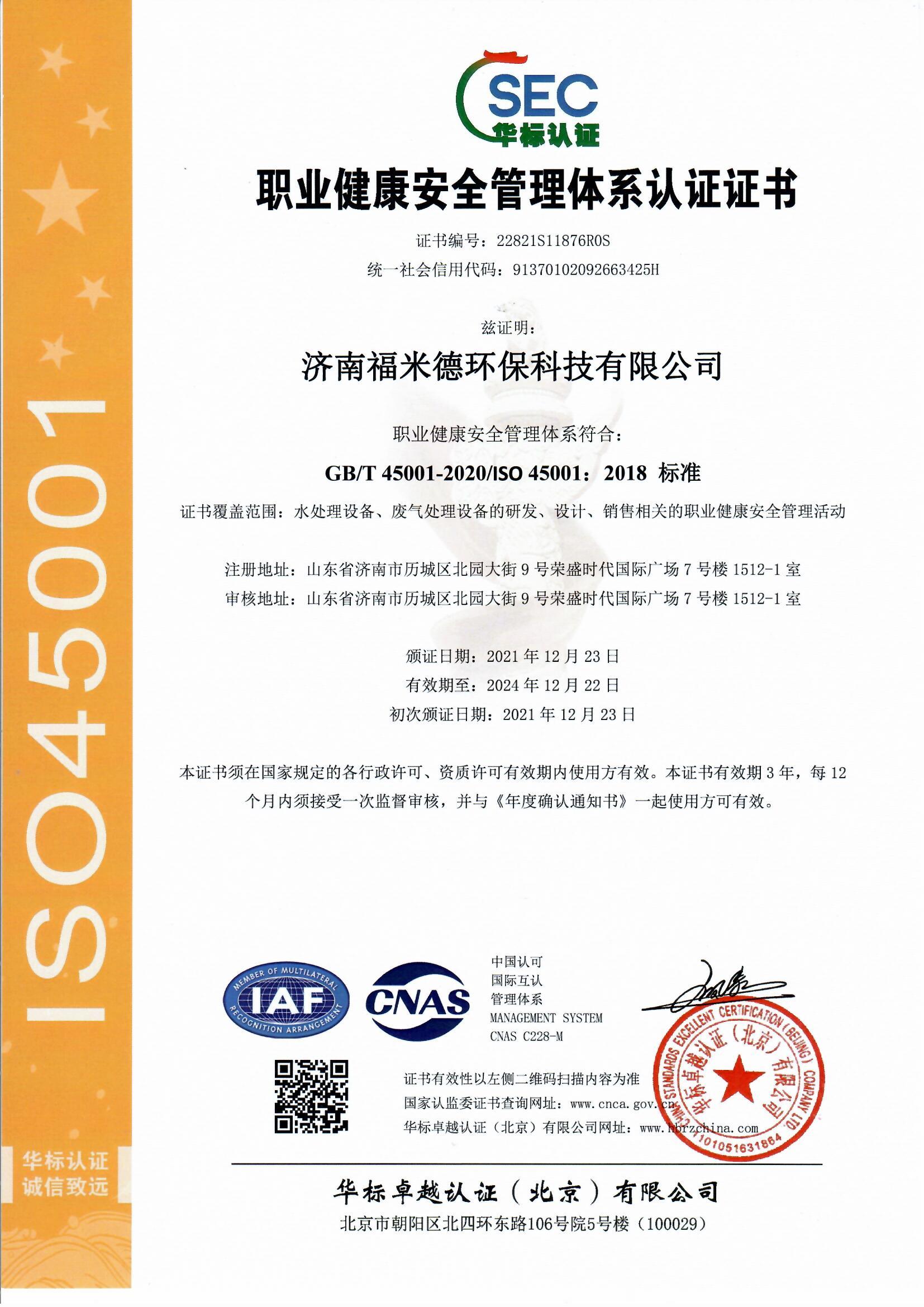 經過我司工作人員和權威認證機構幾個月的努力,我司終于取得三體系(質量管理體系、環境管理體系、職業健康安全管理體系),兩信用(3A級信用企業、重合同守信用企業),中國節能環保等證書。日后,濟南福米德發展將更上一層樓。謝謝新老客戶一直以來對我司的支持與鼓勵。濟南福米德環保科技有限公司主營自清洗過濾器、全程綜合水處理器、紫外線消毒設備、反沖洗過濾器、碟片式過濾器、機械多介質過濾器,全自動鍋爐軟化水等近百個型號的產品。最后!再次恭賀我司通過ISO9001的認證!