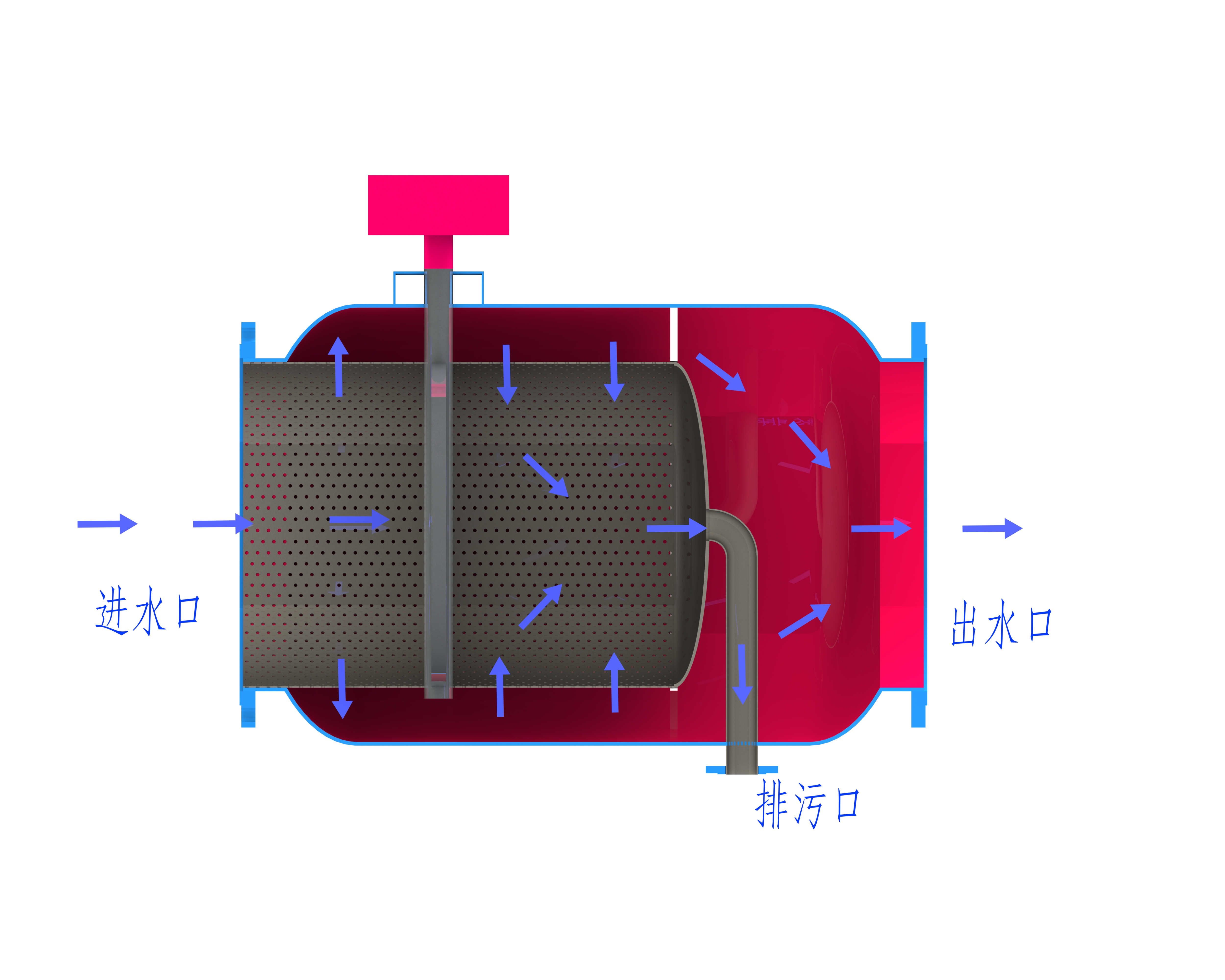 伯努利反洗過濾器主要采購優質碳鋼材質,特殊材質不銹鋼濾網、電動執行器及自動排污裝置組成。當過濾器工作時,電動執行機構引導閥板處于開啟狀態,水流由入口進入過濾器,經過濾網裝置,干凈的水由出水口出。當過濾器處于反沖洗狀態時,關閉導向蝶閥,打開排污電動閥,整個系統可正產運行,無需停機。